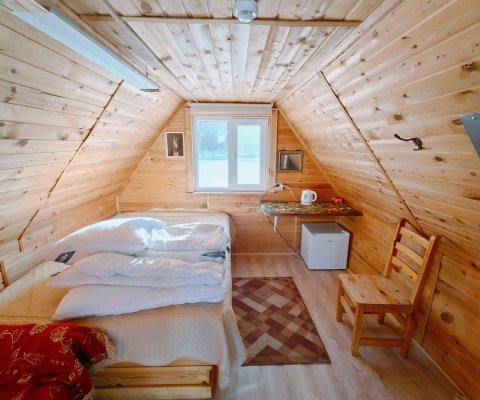 Двухместные домики идеально подойдут для пар. Шаговая доступность к бане и контактному зоопарку. Вокруг домика бегают живые кролики. Двухместные домики расположены близко к центру базы и имеют вид на лес и на контактный зоопарк с разнообразными зверюшками. Около домиков имеются мангалы для мяса. Туалет и душ находятся в отдельном здании
